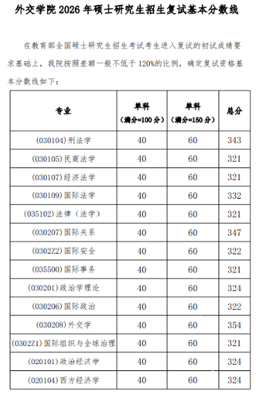 外交学院发布2026年硕士研究生招生复试基本分数线,各专业复试线呈现涨降分化态势,个别专业分数波动幅度较为明显。