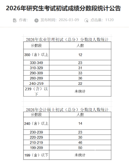 武汉轻工大学管理学院发布2026年硕士研究生招生考试初试成绩分数段统计公告,为考生提供成绩分布参考,便于研判复试竞争态势。