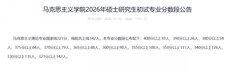 浙江工商大学马克思主义学院发布2026年硕士研究生招生考试初试专业分数段公告,便于考生合理把握竞争态势、科学准备复试。