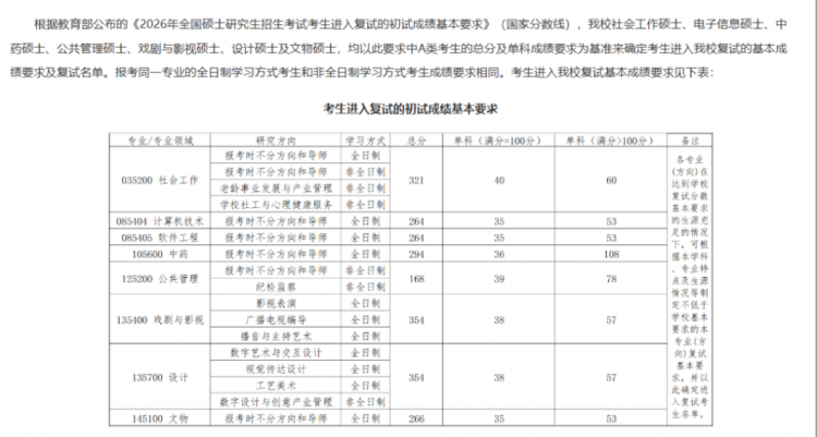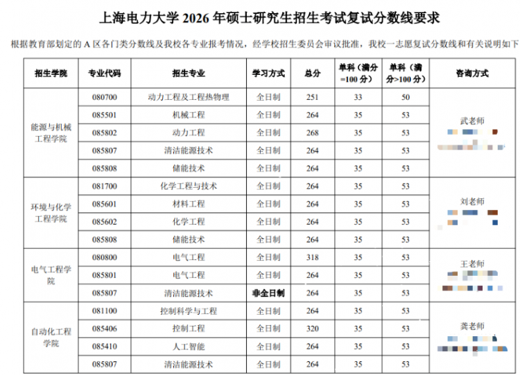 上海电力大学公布2026年硕士研究生招生考试复试分数线要求: