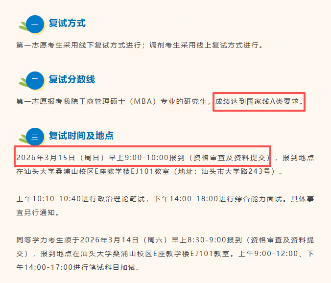 汕头大学商学院发布2026年工商管理硕士(MBA)研究生复试方案: