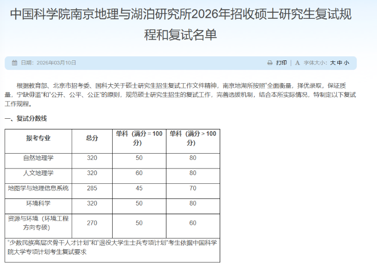 中国科学院南京地理与湖泊研究所发布2026年硕士研究生招生复试规程及复试名单,现场面试定于3月23日(周一)下午、3月24日(周二)全天进行。