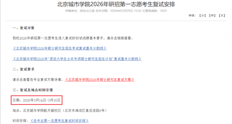 北京城市学院公布2026年硕士研究生招生第一志愿考生复试安排,该校复试工作将于3月14日至16日以现场形式开展。