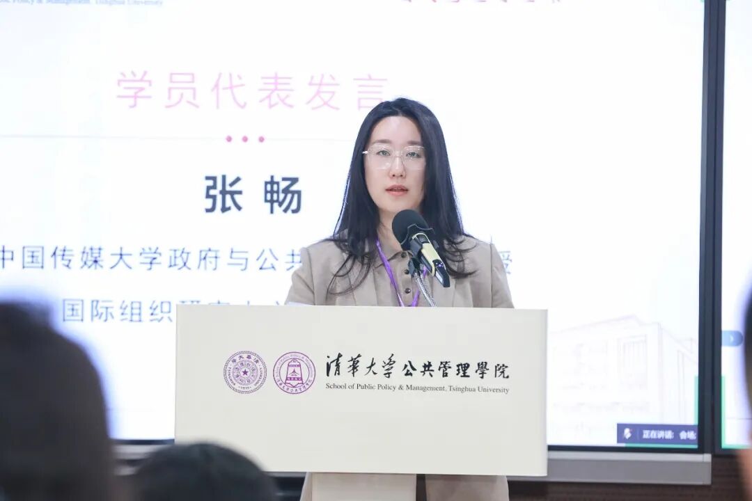 学员代表、中国传媒大学政府与公共事务学院副教授、国际组织研究中心执行主任张畅分享了自己的报名初衷:她结合自身从事全球治理研究与教学的体会,提出在技术规则争夺日益激烈的当下,亟须公共管理的系统视野来应对人工智能治理等跨领域挑战。她期待在清华补上关键一课,并将所学带回课堂,培养更多具备全球胜任力的青年人才。