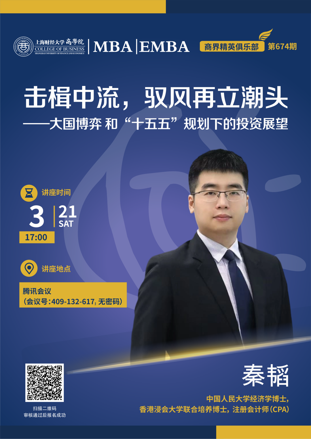 本期讲座特邀中国人民大学经济学博士、香港浸会大学联合培养博士、注册会计师(CPA)秦韬先生,依托其深厚的经济学理论积淀、跨学科研究视野以及扎实的财务专业功底,为与会者深度解析大国博弈对全球及国内投资市场的影响逻辑,系统解读“十五五”规划的核心政策导向与投资机遇,梳理当前投资市场的核心趋势与风险点,分享适配新时代背景的投资思路与实践路径。欢迎扫码报名,与资深专家一同研判大国博弈与“十五五”规划双重背景下的投资新趋势,驭风而上,把握投资新机遇,在时代浪潮中实现资产的稳健布局与价值提升!