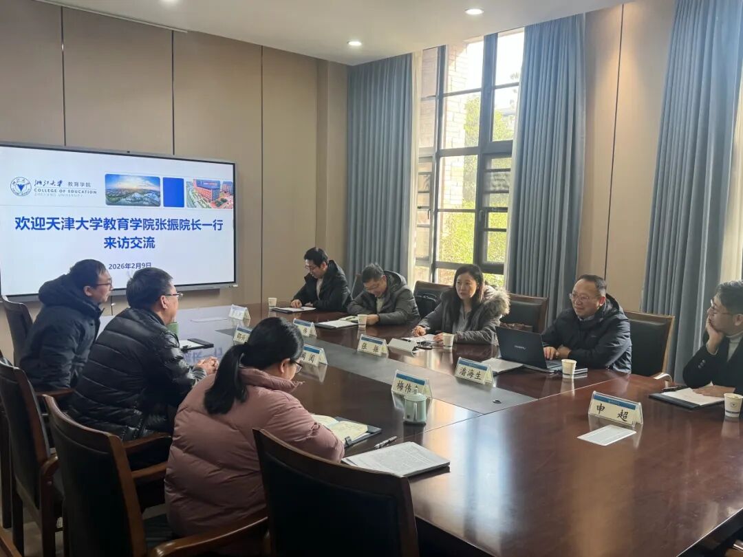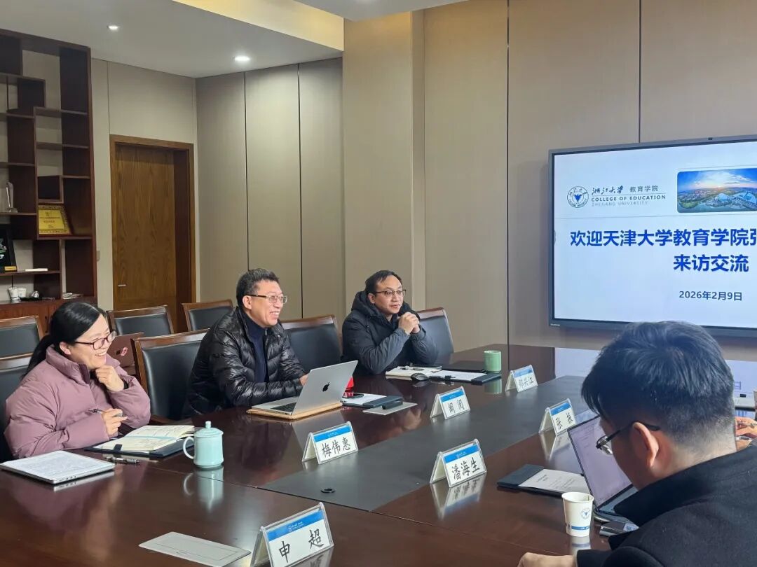 2026年2月9日下午,天津大学教育学院一行来教育学院访问交流。天津大学教育学院院长张振研究员,教师培训中心主任潘海生教授,教育技术系主任董伟教授等一行五人,浙江大学教育学院院长阚阅教授,副院长兼教育学系主任梅伟惠教授,院长助理兼教育领导与政策研究所常务副所长邵兴江教授参与此次交流。双方聚焦国家“十五五”规划蓝图,围绕未来教师教育体系建设、青年教师发展及智慧教育等关键议题,举行了富有建设性的交流座谈。座谈会由浙江大学教育学院院长阚阅主持。