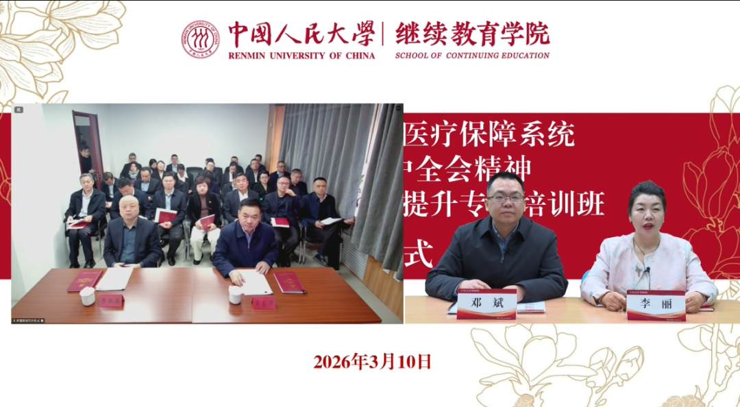 2026年3月10日,新疆维吾尔自治区医疗保障系统党的二十届四中全会精神暨领导干部综合能力提升专题培训班在中国人民大学继续教育学院正式开班。本次培训班共设10个培训专题,邀请中国人民大学、国家医疗保障局、中国劳动和社会保障科学研究院等单位的知名教授和专家学者授课,采用“学在人大-RUC终身学习”平台线上学习的方式完成培训,培训学员约三千余人。