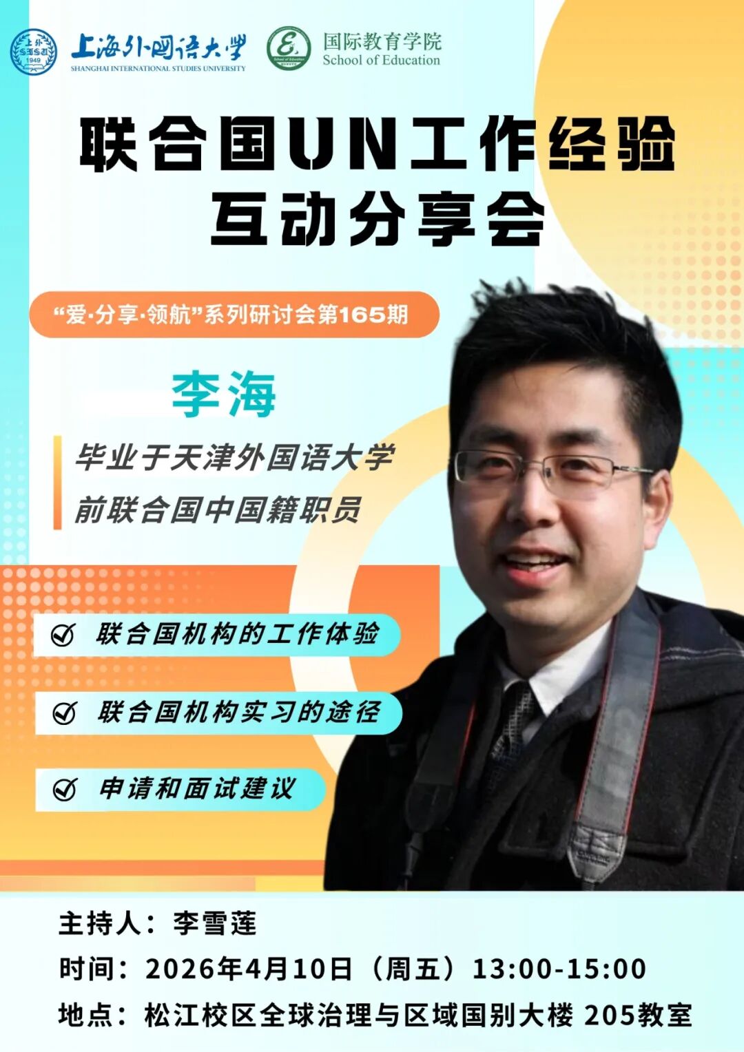 作为具有8年工作经验的联合国前职员,李海老师在此次分享会上将为大家分享在联合国机构的工作体验,介绍在联合国机构实习的途径以及为大家申请和面试提供参考与建议。欢迎对国际组织,联合国工作感兴趣的同学踊跃参加。