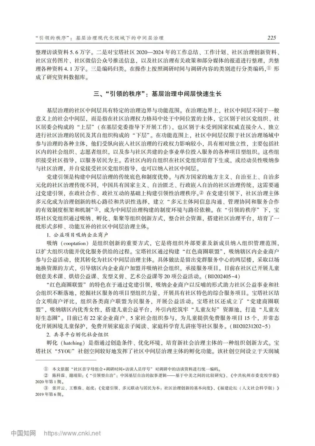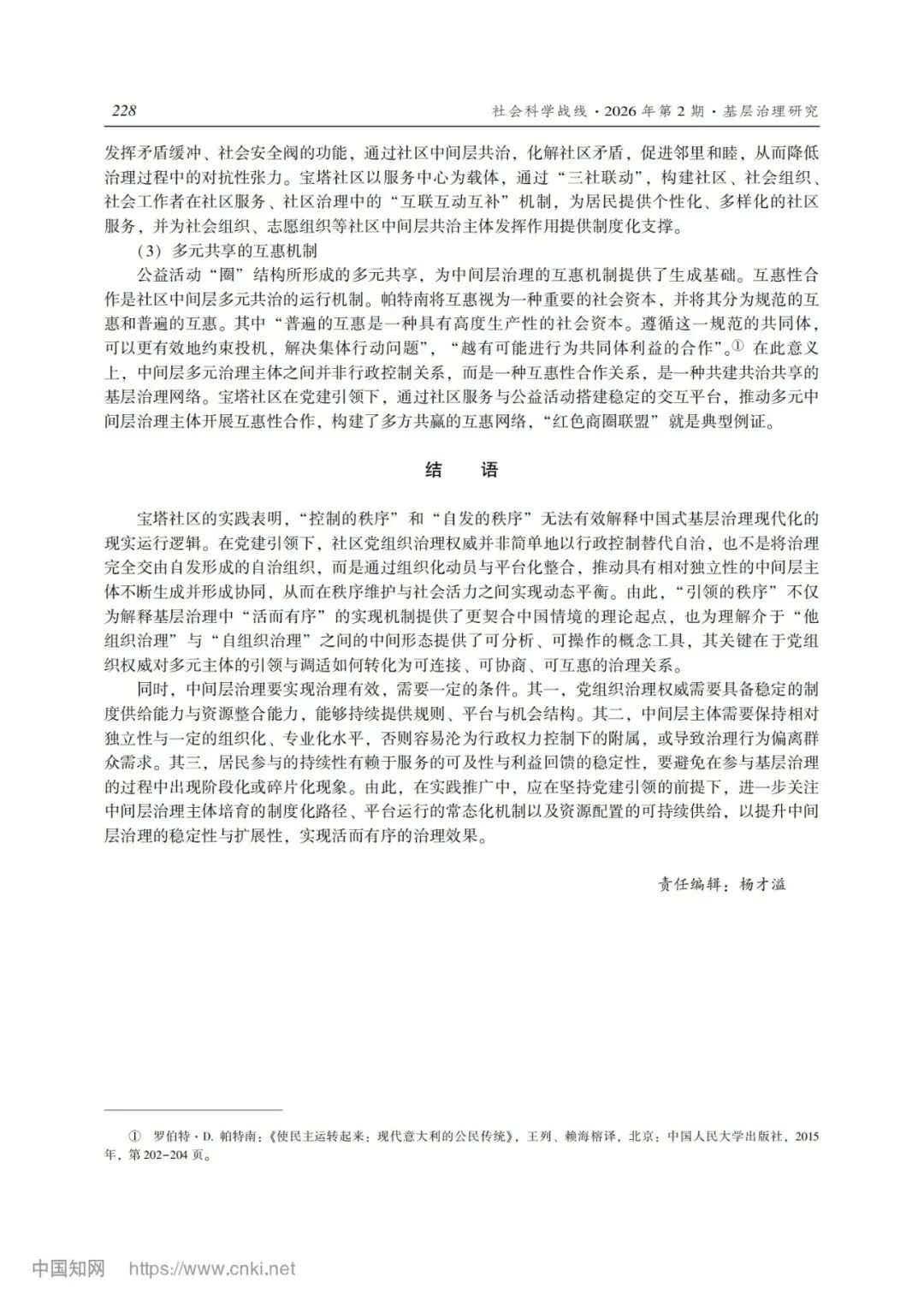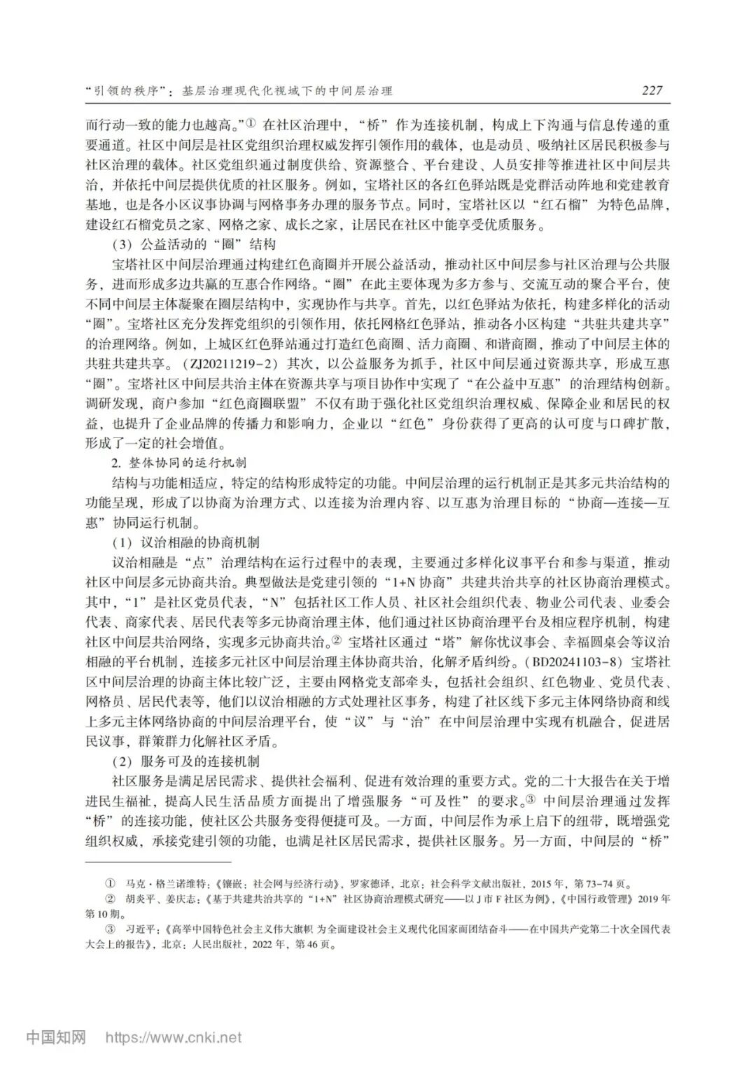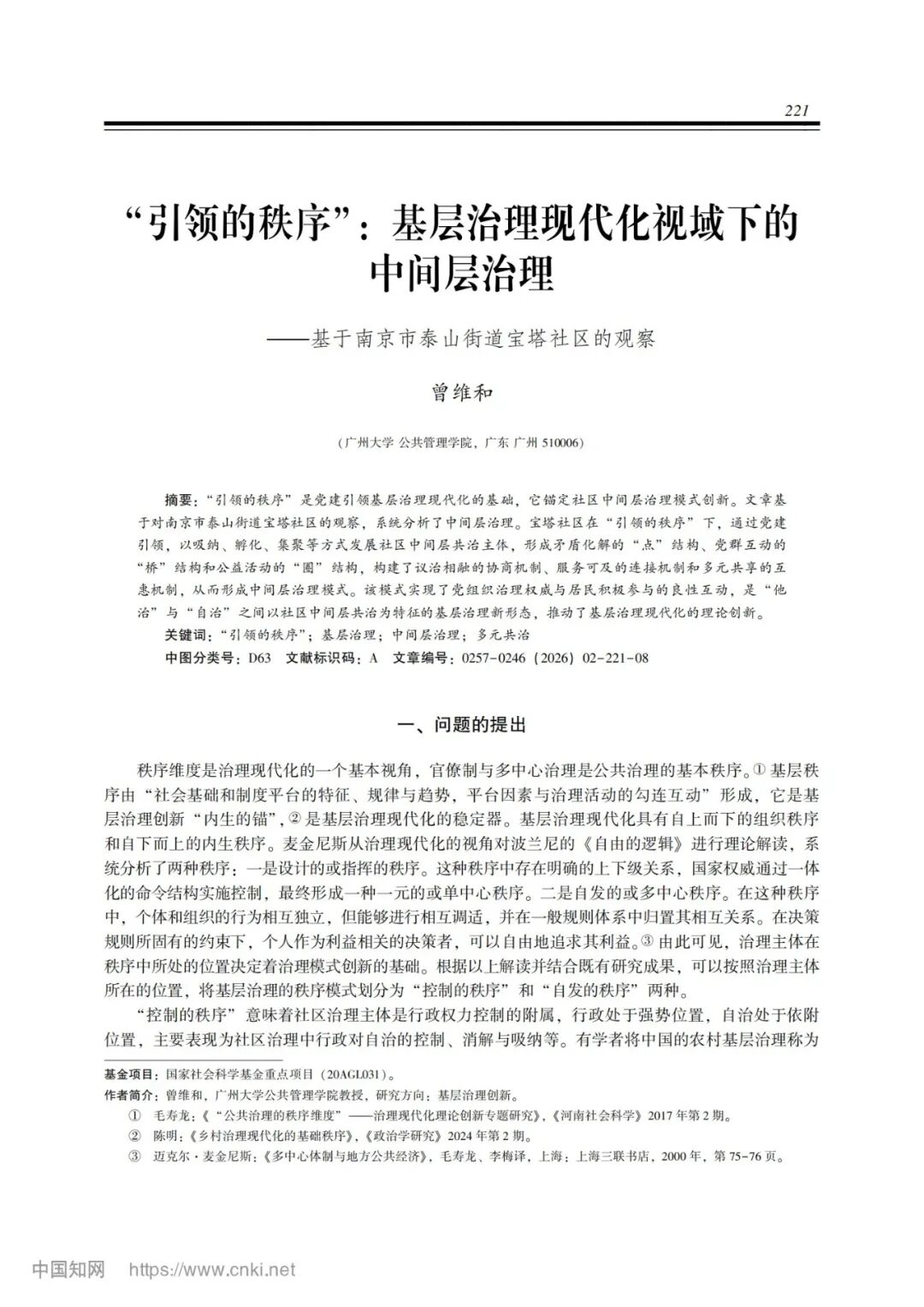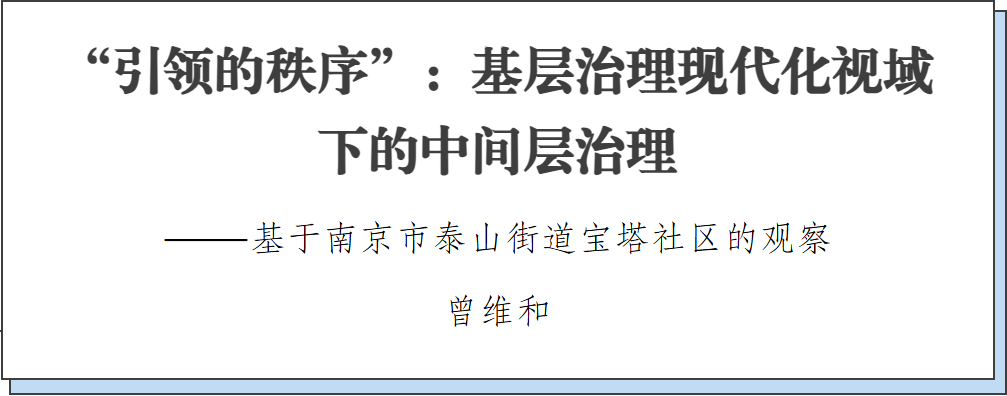 摘要:“引领的秩序”是党建引领基层治理现代化的基础,它锚定社区中间层治理模式创新。文章基于对南京市泰山街道宝塔社区的观察,系统分析了中间层治理。宝塔社区在“引领的秩序”下,通过党建引领,以吸纳、孵化、集聚等方式发展社区中间层共治主体,形成矛盾化解的“点”结构、党群互动的“桥”结构和公益活动的“圈”结构,构建了议治相融的协商机制、服务可及的连接机制和多元共享的互惠机制,从而形成中间层治理模式。该模式实现了党组织治理权威与居民积极参与的良性互动,是“他治”与“自治”之间以社区中间层共治为特征的基层治理新形态,推动了基层治理现代化的理论创新。