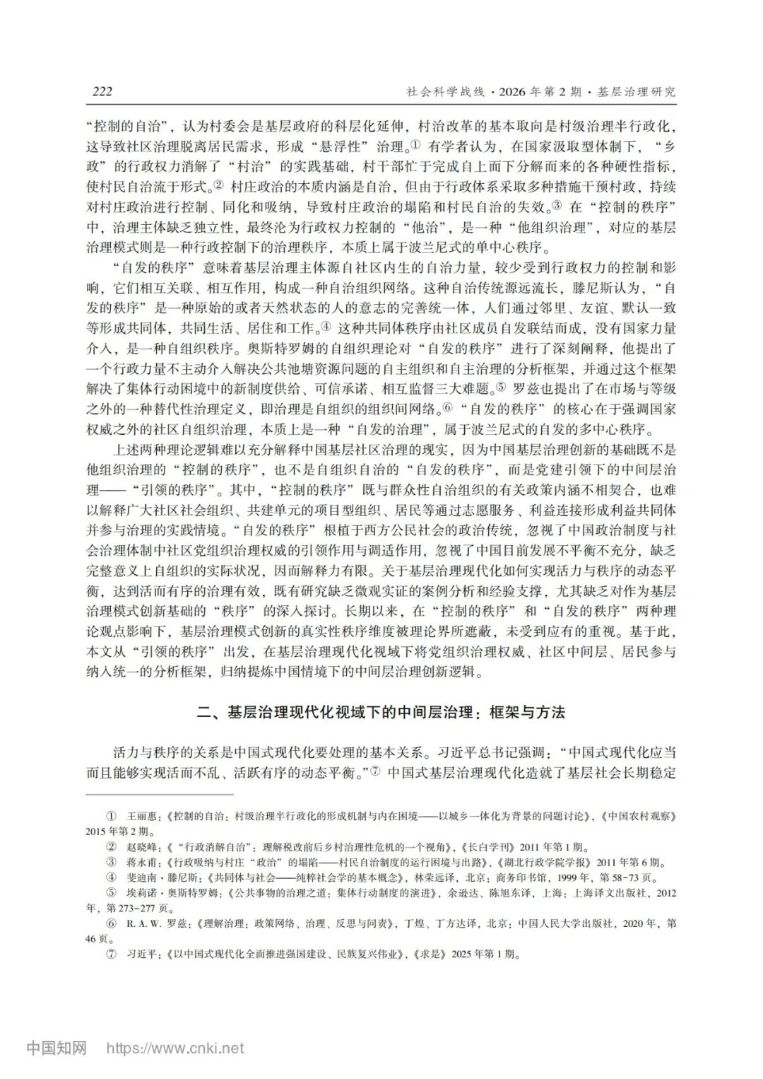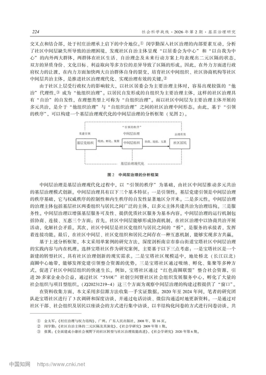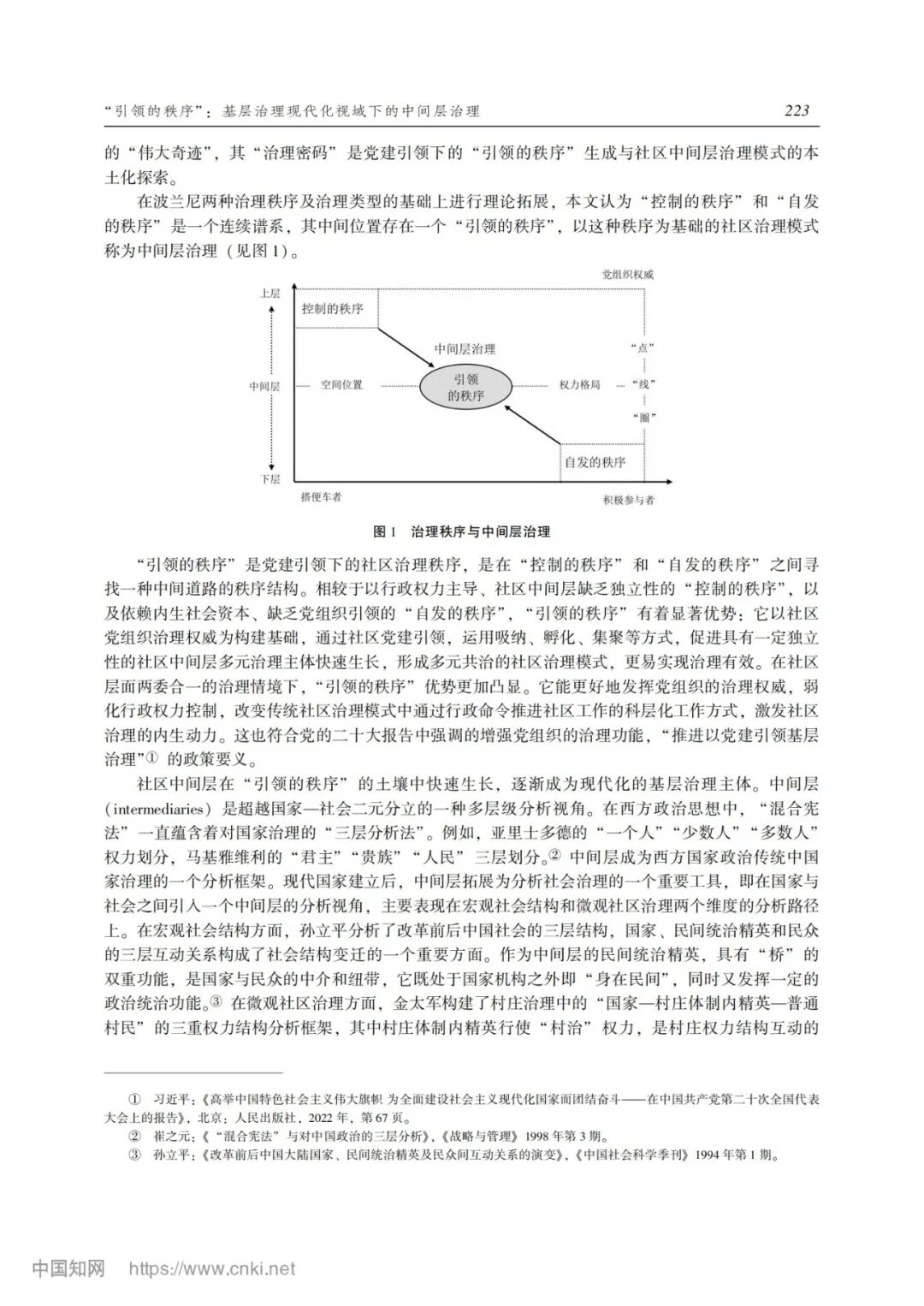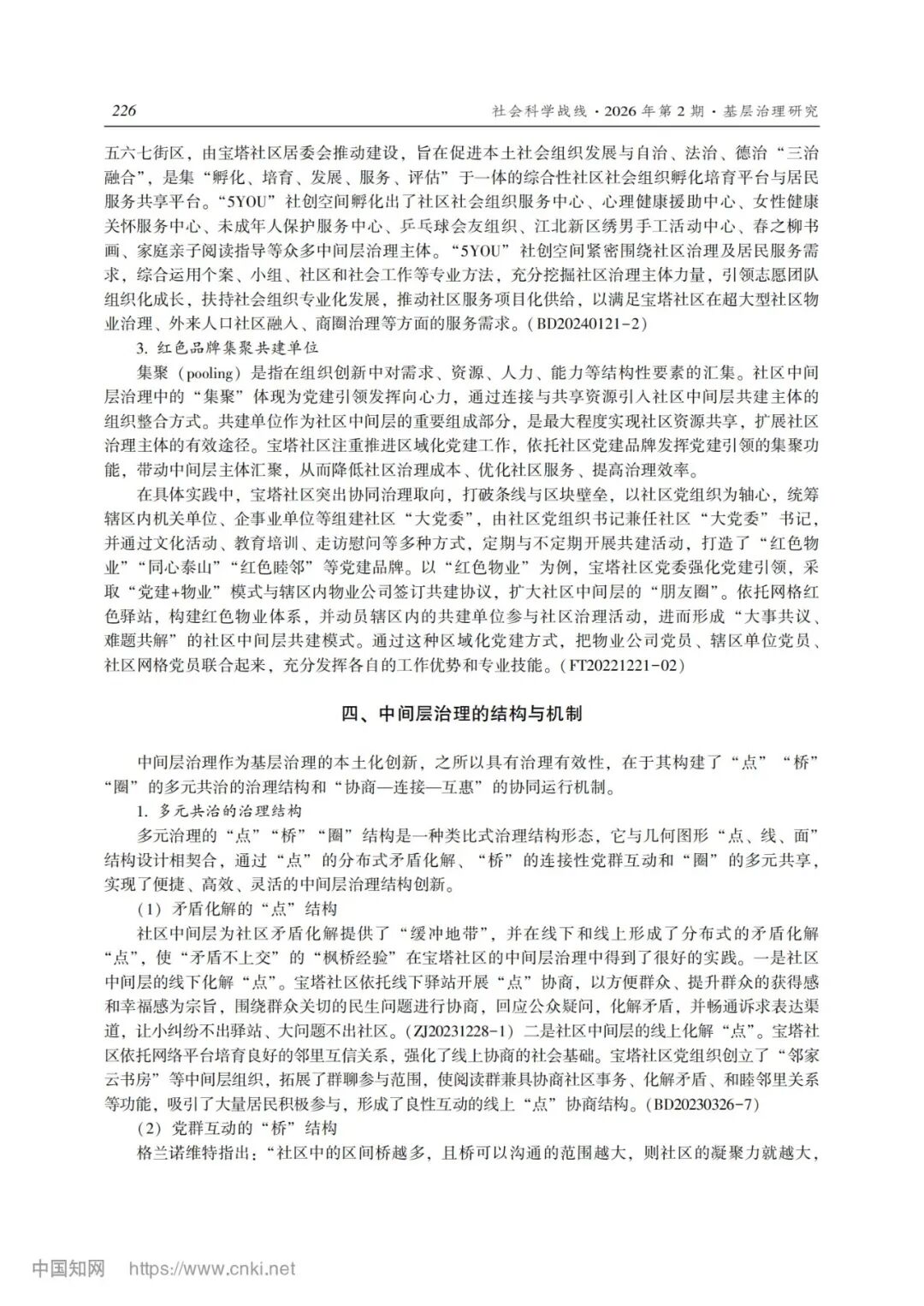 摘要:“引领的秩序”是党建引领基层治理现代化的基础,它锚定社区中间层治理模式创新。文章基于对南京市泰山街道宝塔社区的观察,系统分析了中间层治理。宝塔社区在“引领的秩序”下,通过党建引领,以吸纳、孵化、集聚等方式发展社区中间层共治主体,形成矛盾化解的“点”结构、党群互动的“桥”结构和公益活动的“圈”结构,构建了议治相融的协商机制、服务可及的连接机制和多元共享的互惠机制,从而形成中间层治理模式。该模式实现了党组织治理权威与居民积极参与的良性互动,是“他治”与“自治”之间以社区中间层共治为特征的基层治理新形态,推动了基层治理现代化的理论创新。