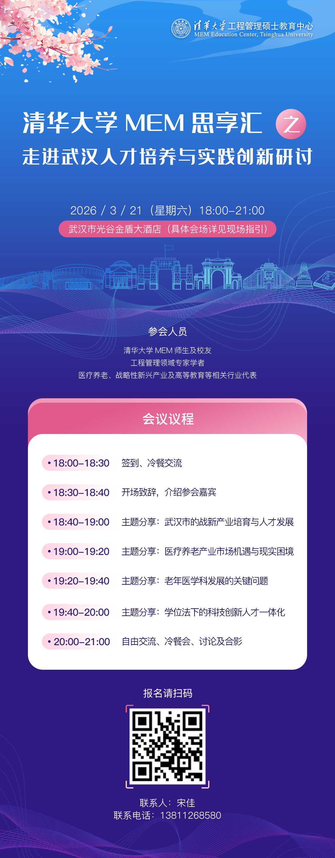 为响应国家科技教育人才一体化发展战略,探讨工程管理人才培养与实践创新路径,进一步加强跨领域交流与合作,我们将于3月21日(周六)晚18:00-21:00在武汉光谷金盾大酒店举办“清华大学MEM思享汇之走进武汉”专场活动。