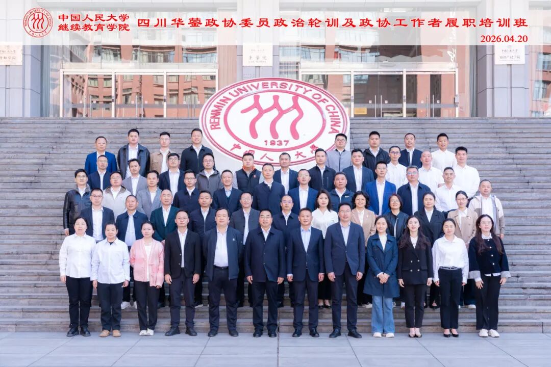 2026年4月20日,四川华蓥政协委员政治轮训及政协工作者履职培训班在中国人民大学继续教育学院顺利开班。华蓥市政协党组书记、主席熊良平,中国人民大学继续教育学院副院长陈昌远出席开班仪式。来自华蓥市政协委员及政协工作者54人参加本次开班仪式。开班仪式由中国人民大学继续教育学院党政与企事业发展中心班主任李曜嘉主持。