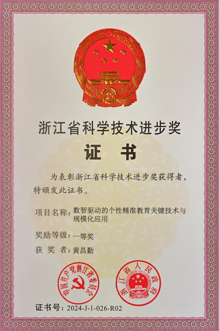 近日,2024年度浙江省科学技术进步奖正式公布,我院黄昌勤教授作为第2完成人的成果“数据驱动的个性精准教育关键技术与规模化应用”和陈静远研究员作为第5完成人的成果“垂域场景中模型协同智能场景化支撑平台与示范应用”双双获得浙江省科学技术进步奖一等奖。