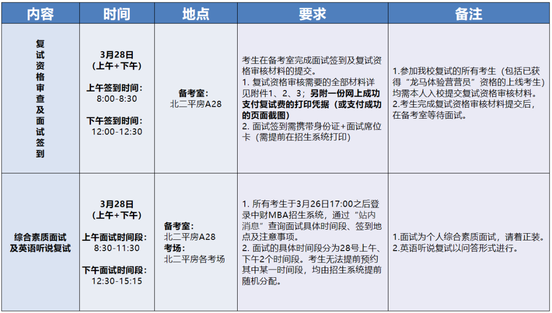 2.未获得“龙马体验营营员”资格的上线考生注意:登录招生系统后,请在材料提交截止时间(2026年3月25日12:00点)前,按系统内“2026年中财全日制MBA复试考生须知”的要求,完成面试材料的填报并提交。如考生逾期未提交材料或材料审核未通过,将无法获得面试资格。