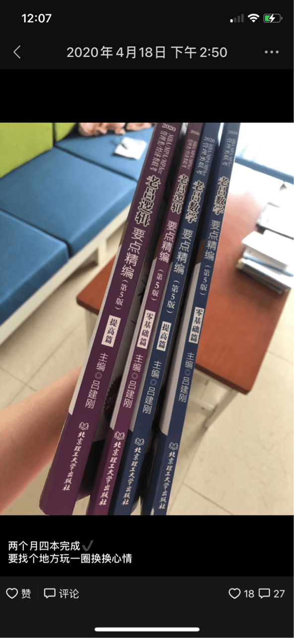 这个月开始进行强化学习,因为基础篇是年初学的已经忘了一部分,用了半个月的时间复习基础篇。之后就开始做老吕母题800练和前文所说的不断试验适合自己的逻辑老师。并且开始介入作文搜集素材+练笔的阶段,作文跟的是老吕和张乃心。
