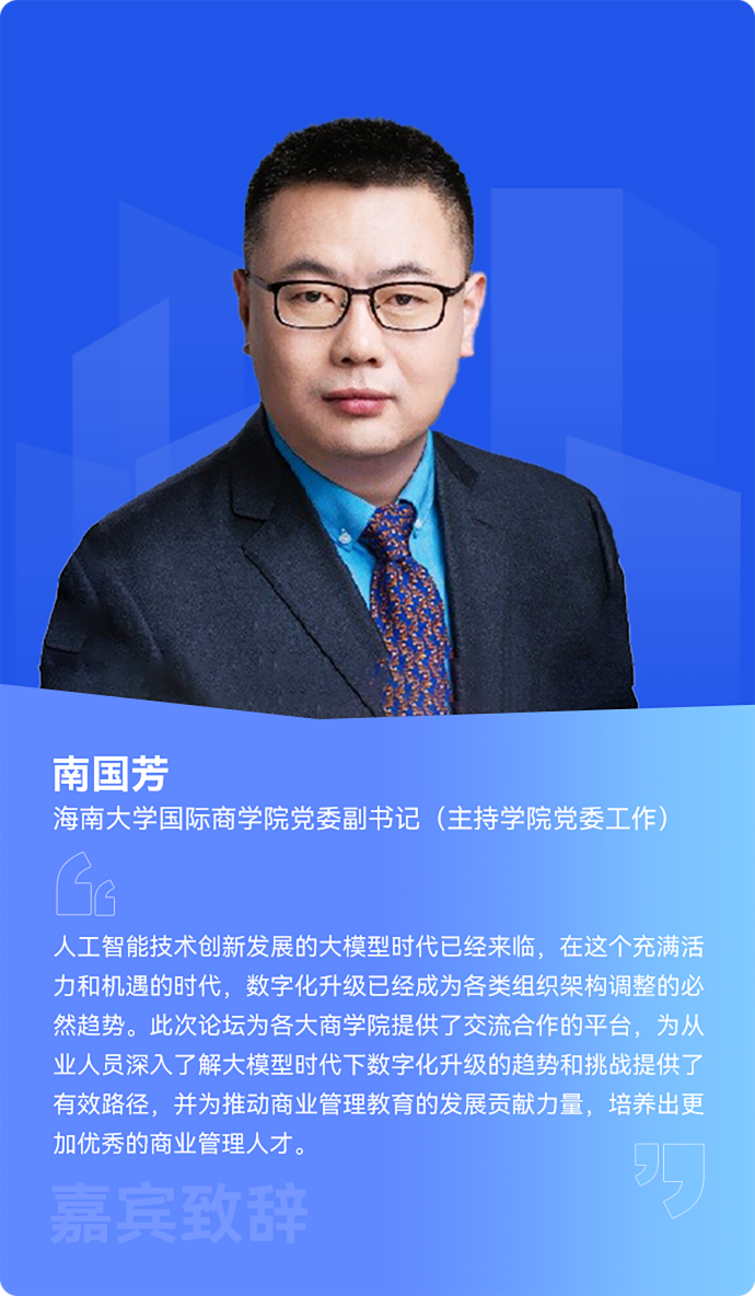 10月26日-28日,第十二届商学院数字化论坛“大模型时代下的数字化升级”于海南海口顺利举办。聚焦大模型时代前沿研究分享重要议题,共同探讨数字化升级的未来之路。本次论坛由MBAChina主办,海南大学国际商学院承办。来自清华、复旦、上交、南开、长江、中欧等全国50余所商学院100余位领导、技术专家、老师参加论坛并交流。
