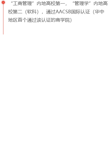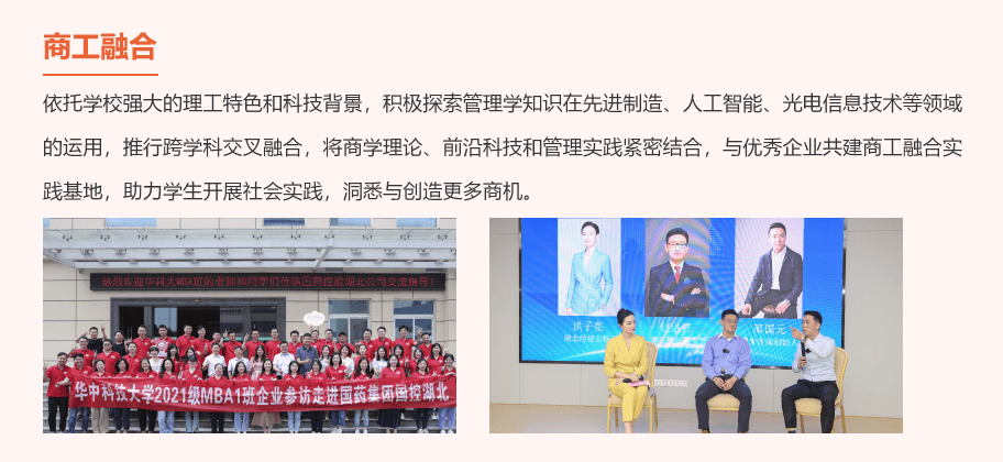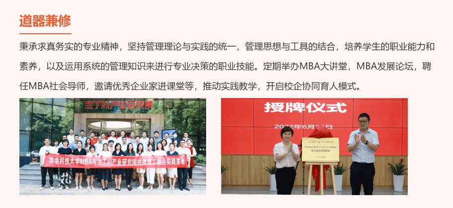 华中科技大学管理学院于2020年通过全球最高水平商学院AACSB认证,2021年通过AMBA再认证;在泰晤士第二届中国学科评级中, “工商管理” 和 “管理科学与工程” 获评A级学科;在2022年的软科世界一流学科排名中, “工商管理” 位居内地高校第一, “管理学” 位居内地高校第三。依托学校与学院的优势学科资源和雄厚师资力量,MBA项目深耕商学教育30年,形成了 “商工融合,道器兼修,胸怀天下,智领未来” 的项目特色。
