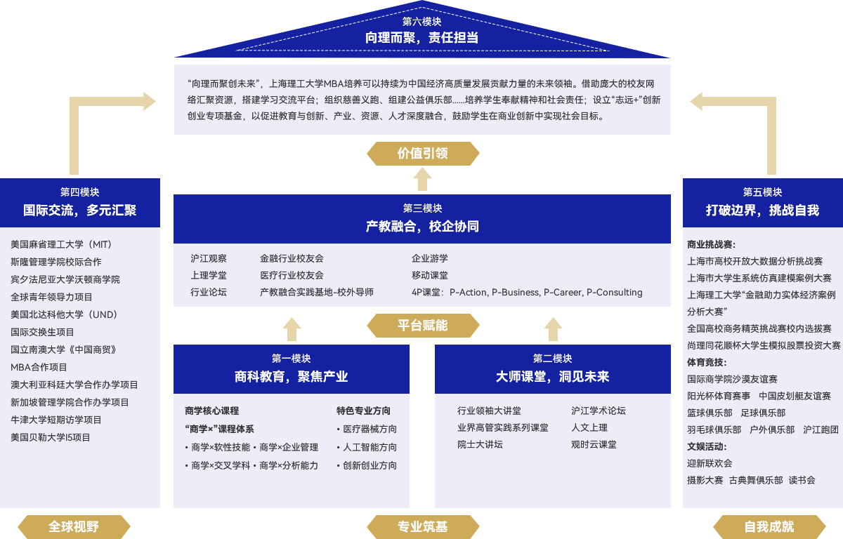 “百年沪江,思学志远”,上海理工大学MBA项目培养体系囊括六大模块,扎根商学基础,精进学生专业特长,通过产教融合平台,深入企业,学以致用。项目立足本土,面向世界,拓展学生国际视野,并且组织丰富多彩的学生活动,让学生在挑战自我的过程中成就价值。从学术深度、平台广度、视野阔度,全方位培养具有高度社会责任感的商业领袖。