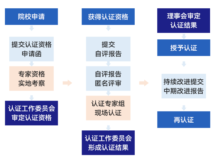 在认证流程方面,并非注重在一个时间点上的成绩,而是持续进步的过程,力求通过认证过程帮助参评学院及项目建立符合战略定位、回应国家战略需求、突出自身特色优势的MBA/EMBA项目。对于取得认证的项目,通过再认证等工作,敦促商学院不断创新、持续改进;对于没有取得认证的项目,这套认证体系也为其提供了未来自我改进的依据和目标,既提供了再次取得认证的机会,同时也为MBA/EMBA项目的质量改进提供引导。