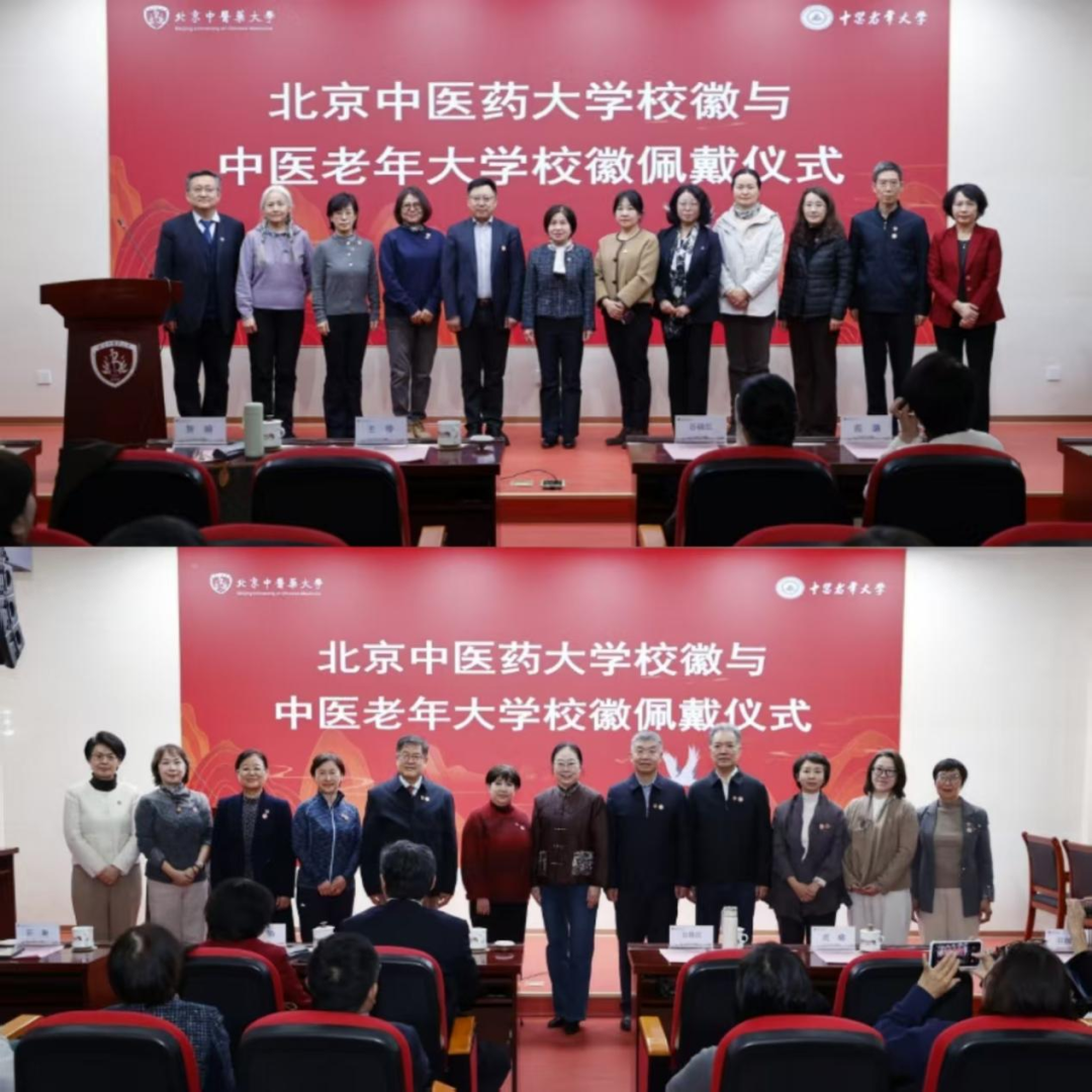 在校徽佩戴仪式环节,与会领导为新学员代表佩戴了北京中医药大学校徽和中医老年大学专属徽章。这不仅象征着学员们正式成为北中医大家庭的一员,更代表着一种文化的认同与责任的传承。现场学员纷纷整理衣襟,佩戴徽章,脸上洋溢着自豪与喜悦的笑容。