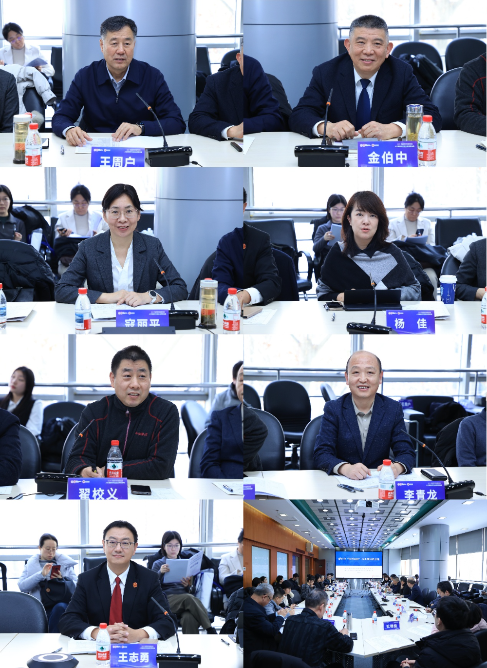 王周户主持,金伯中、寇丽平、杨佳、翟校义、李青龙、王志勇作主题报告(按发言顺序从上到下、从左到右排列)