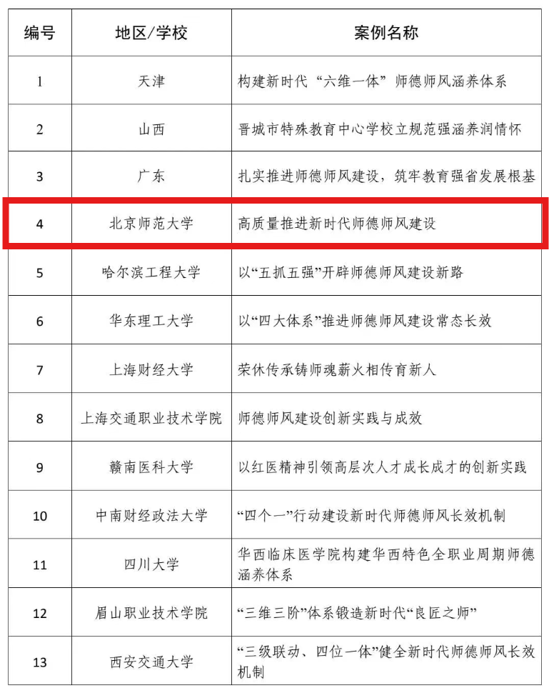 北京师范大学报送的《健全长效机制,夯实主体责任,高质量推进新时代师德师风建设》入选“师德师风建设”领域创新案例。
