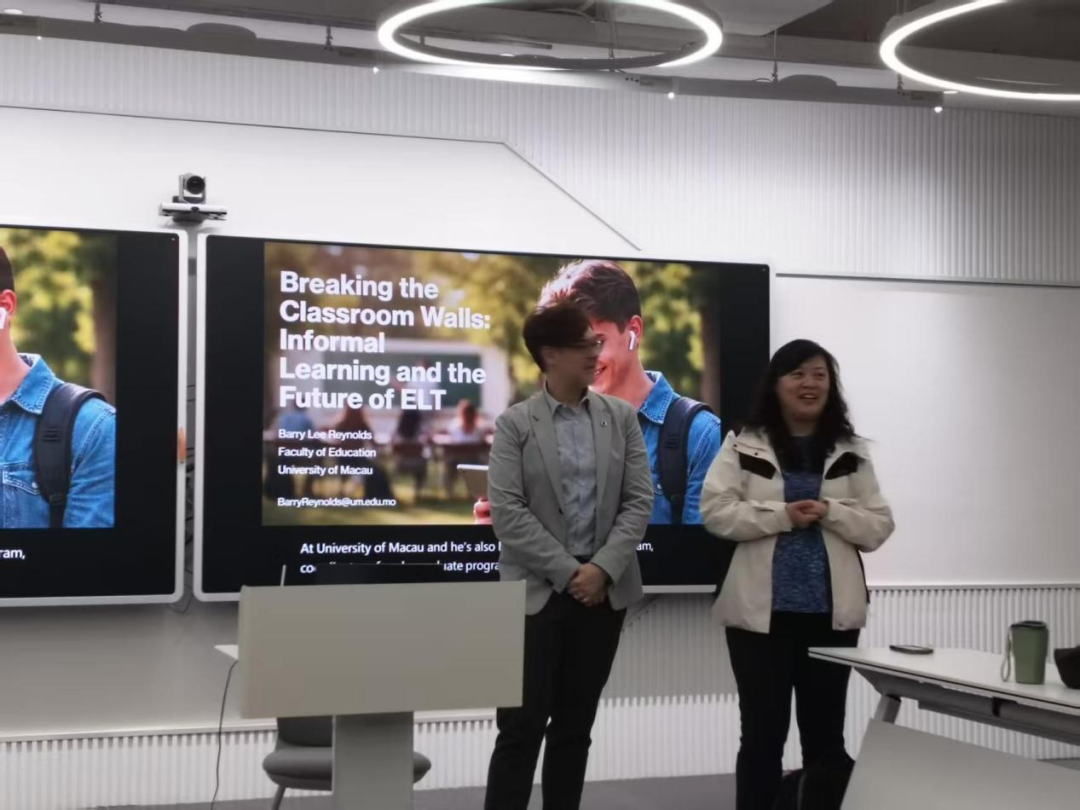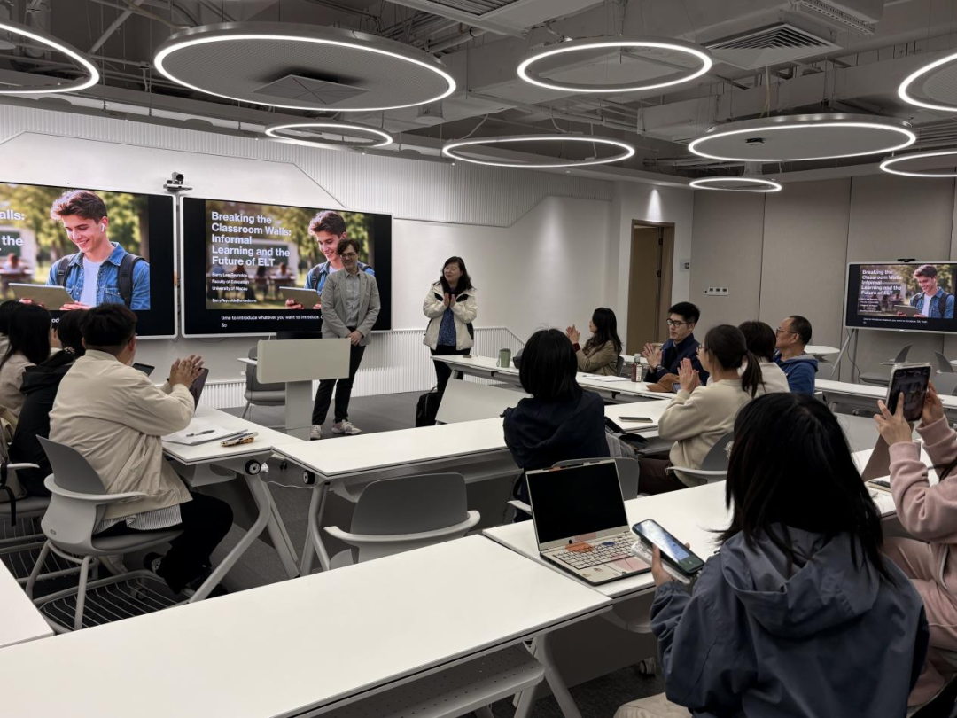 2026年4月7日晚,澳门大学Barry Lee Reynolds博士应邀到访上海外国语大学,在全球治理与区域国别大楼205教室带来题为“打破课堂藩篱:非正式学习与英语教学的未来(Breaking the Classroom Walls: Informal Learning and the Future of ELT)”的学术讲座。本次讲座由国际教育学院黄芳老师主持,吸引了众多师生到场聆听,共同探讨英语教学的新趋势与新路径。