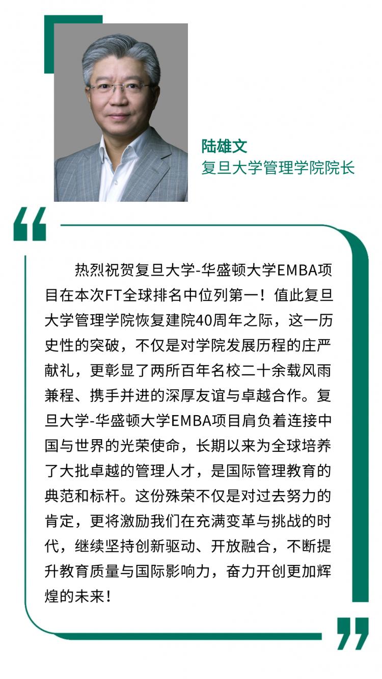复旦大学-华盛顿大学EMBA项目是中国大陆大学商学院参加FT排名最早、连续参评时间最长、进入全球前十次数最多的EMBA项目。2006年首次参评就跻身全球第八,此后连续八年位列全球前十。长期以来,复旦大学-华盛顿大学EMBA项目在课程设计、校友网络生态、学术科研发展等方面与日俱进、厚积薄发。今年,项目再获历史性突破,在FT全球EMBA排名中位列第一,这一成果既凸显了项目在国际化进程中领先的学术地位,也彰显了其对卓越品质始终不渝的追求。