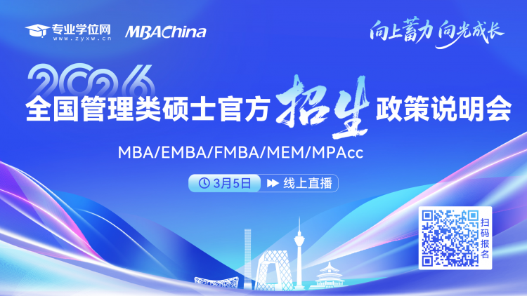汇聚热门项目,一站式了解招生政策本次政策说明会涵盖国内众多知名商学院的管理类硕士项目,包括MBA(工商管理硕士)、EMBA(高级管理人员工商管理硕士)、FMBA(金融工商管理硕士)、MEM(工程管理硕士)、MT(税务硕士) 等热门专业方向。活动将邀请各院校招生负责人亲临直播间,深度解读2026级招生政策、培养方案、报考条件、面试流程及奖学金设置等考生最为关注的核心信息。线上直播互动,零距离答疑解惑说明会将以线上直播的形式进行,考生可通过手机或电脑轻松参与。活动不仅设有院校宣讲环节,更安排了互动答疑时段,考生可就个人报考疑问直接与招生老师交流,获取第一手权威解答。无论是对项目选择感到迷茫,还是对备考规划需要指点,本次说明会都将提供宝贵的参考。本次活动共计超过50+院校进行宣讲,精彩不容错过,欢迎大家添加小砖的微信,有任何问题都可以找小砖解答,您的上岸最佳伙伴~扫码即刻报名,锁定直播席位活动全程公益,不收取任何费用。即日起,考生可扫描下方海报二维码,填写个人信息即可完成报名。报名成功后,我们将于活动前通过短信或微信发送直播链接,提醒您准时观看。让我们相约3月5日,聆听官方声音,明确报考方向,在管理精英的成长之路上“向上蓄力,向光成长”!关于MBAChina与专业学位网MBAChina作为国内领先的管理类硕士招生服务平台,多年来致力于为考生提供全面的院校资讯、备考资料及招生咨询服务。专业学位网则专注于专业学位教育领域,聚合了丰富的院校资源和行业动态。双方联合举办的官方政策说明会,已成为众多考生了解招生政策、选择心仪院校的重要渠道。