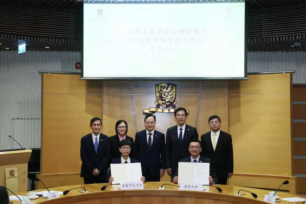 在李路明、卢煜明等见证下,清华大学公共管理学院院长朱旭峰与香港中文大学社会科学院院长冯应谦代表双方签署合作备忘录。两院将围绕“人工智能赋能全球治理”这一主题,在教育与科研领域开展多元交流与合作。在港期间,朱旭峰还拜访了香港教育大学前校长、香港运输及房屋局前局长、亚洲公共行政学会前会长张炳良。